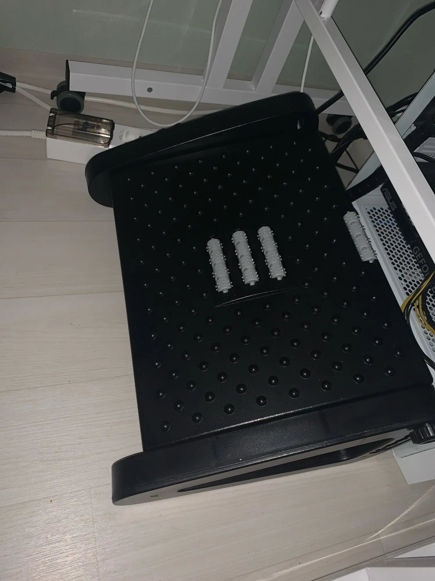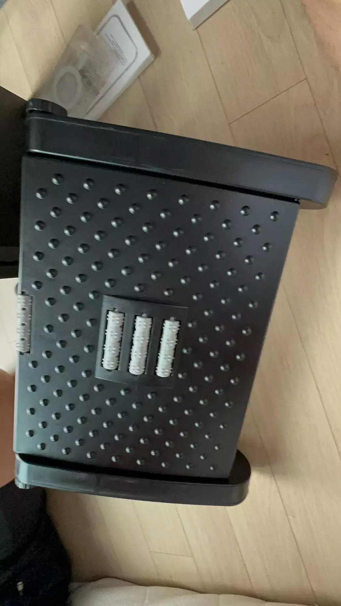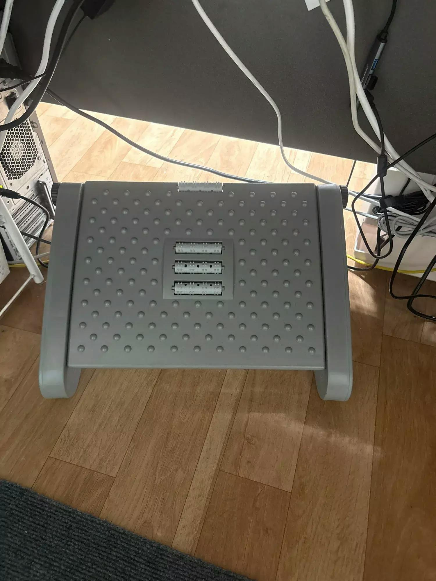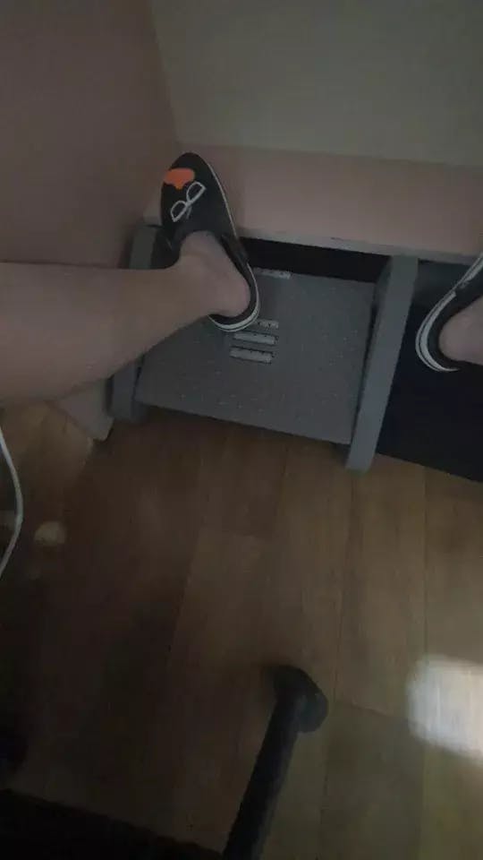 It’s 42 × 31 × 19 cm — compact enough to fit under most desks but large enough to keep your feet comfortable.
