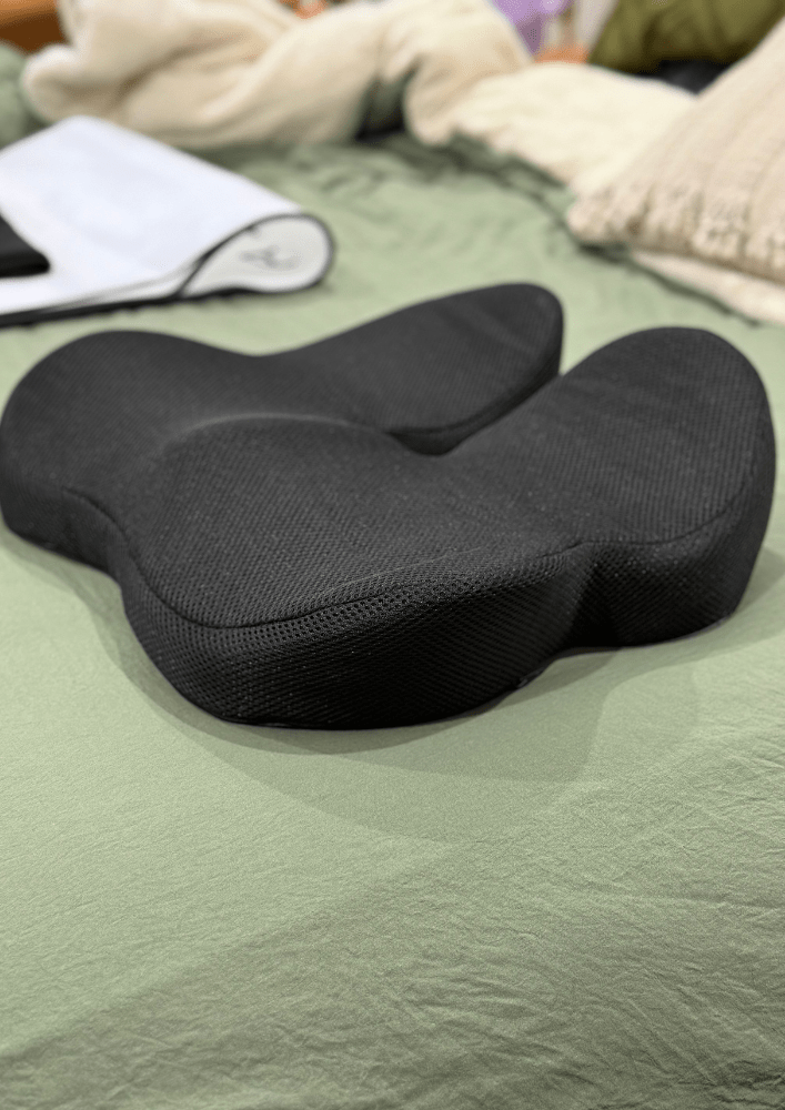 Notice the two soft contours on the cushion — that’s where your thighs should rest. Sitting in this position relieves pressure from your hips and legs, giving balanced, all-day comfort.